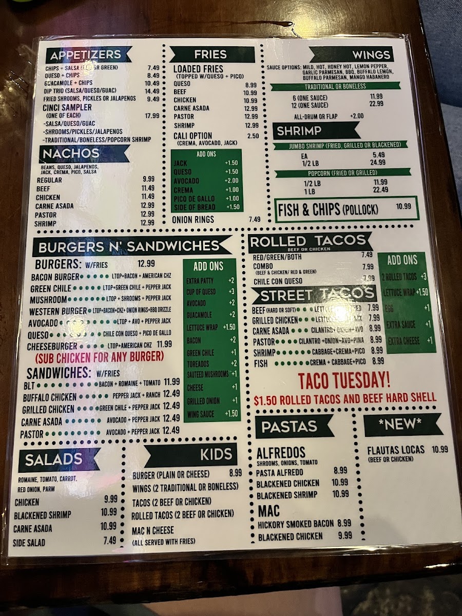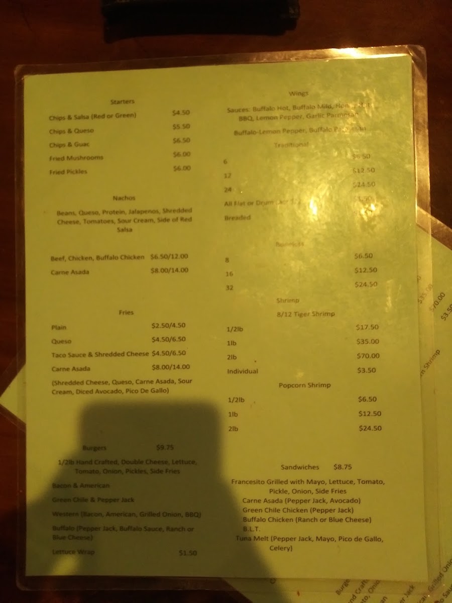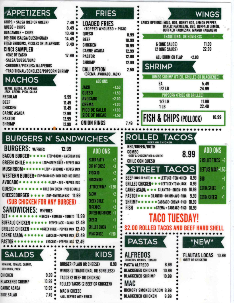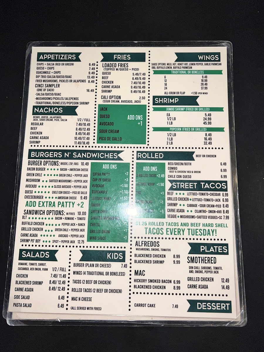 The menu offers a variety of bar and grill options, featuring a selection of appetizers, main dishes, salads, and kid-friendly meals. Visitors can find classic bar fare such as traditional wings, rolled tacos with red and green sauces, and loaded nachos. There are also specialty items like carne asada nachos and chicken sandwiches, alongside vegetarian options including a veggie taco and salads.