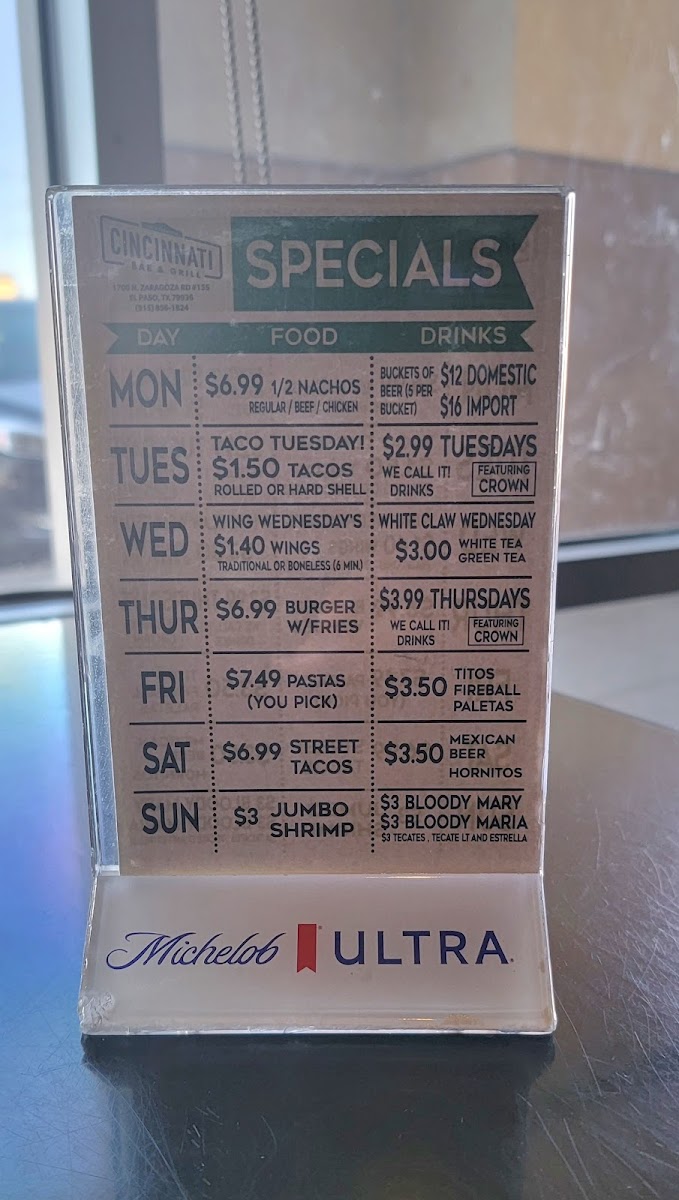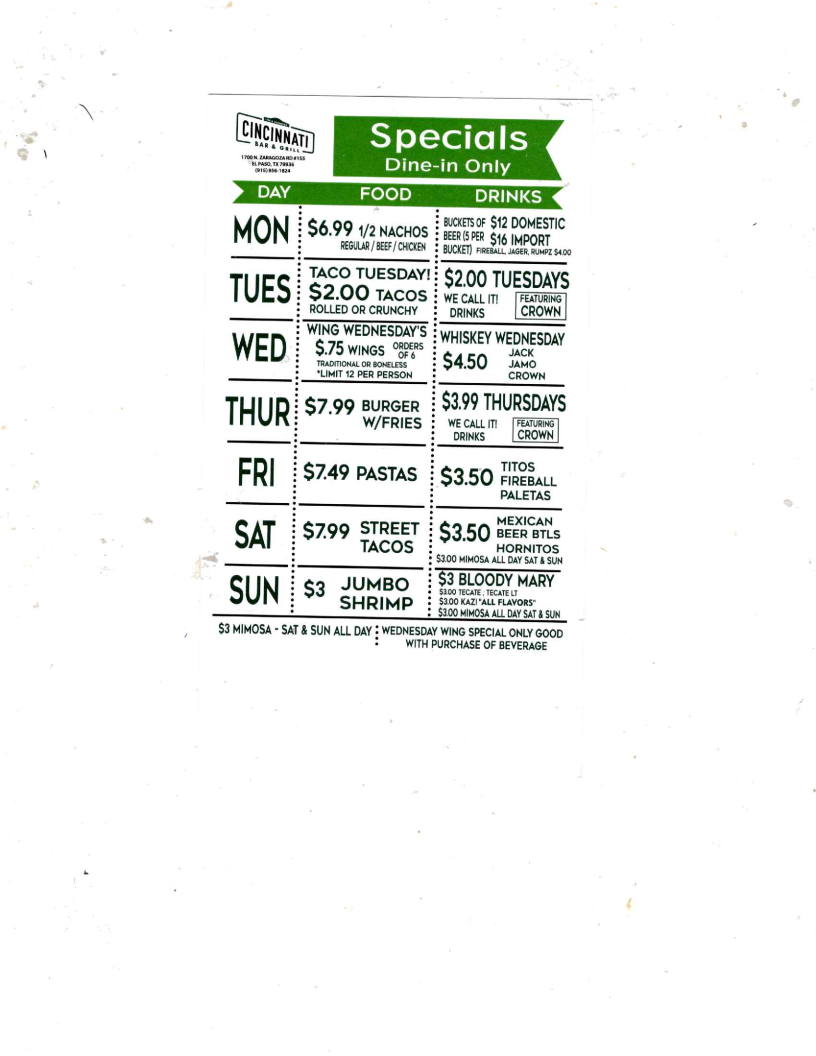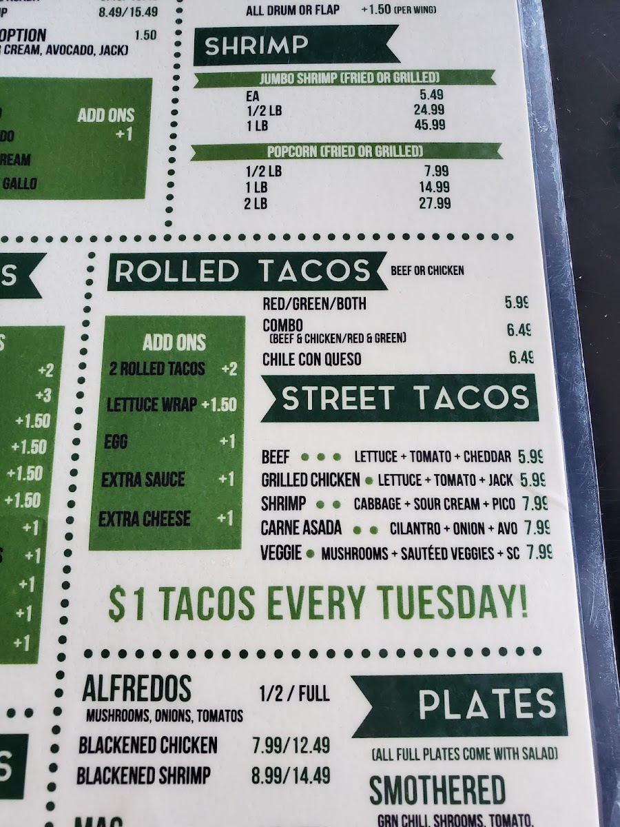 - Kids’ Menu: Includes burger options (plain or cheese), wings (traditional or boneless), tacos, rolled tacos, and mac and cheese, each served with fries.
